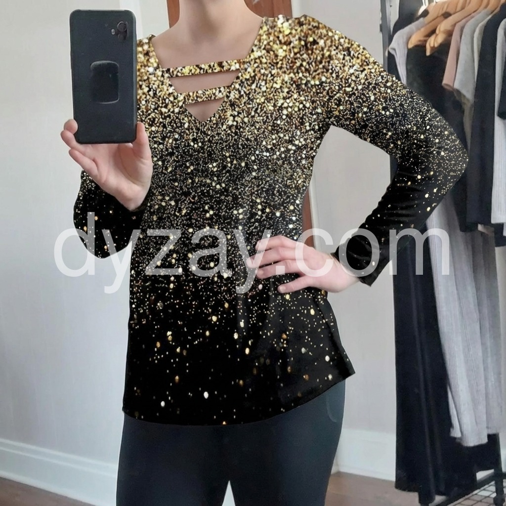 Just in time for your next glam holiday vacay! This sultry, strappy caged shirt has a v-neckline that awaits your favorite layering necklaces or statement jewels. This unique long-sleeved top sparkles with a generous sprinkle of metallic ombre silver and gold print, perfect for pairing with jeans or black slacks, boots, and metallic heels. Machine wash cold tumble dry low to medium heat. Iron if needed or lay flat to dry.