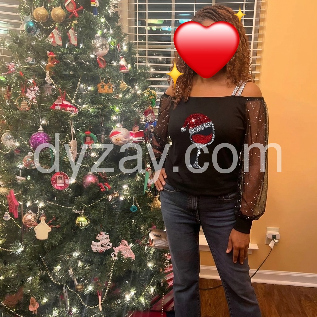 This elegant long-sleeved holiday Christmas shirt features a glittering print of a tipsy red wine glass with a Santa Claus hat, spreading the holiday cheer with a super-fun vibe, ready for par-tay good times! This black off-shoulder asymmetrical shirt features sheer long sleeves elevating this top to a luxe look for any date night. Machine wash cold tumble dry low to medium heat. Iron if needed or lay flat to dry.